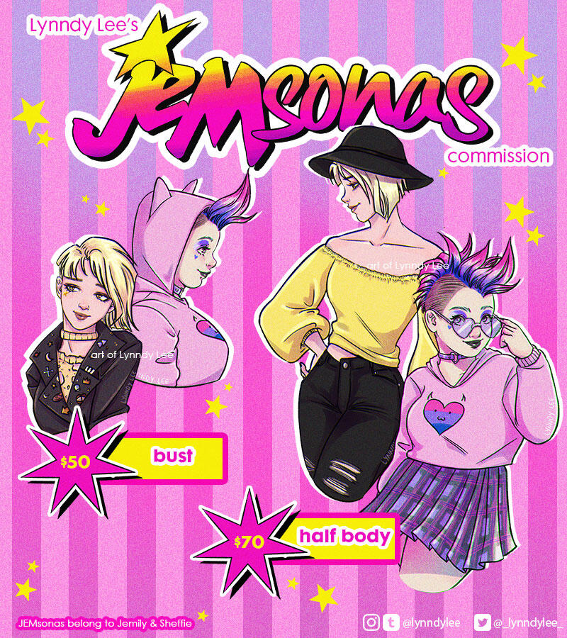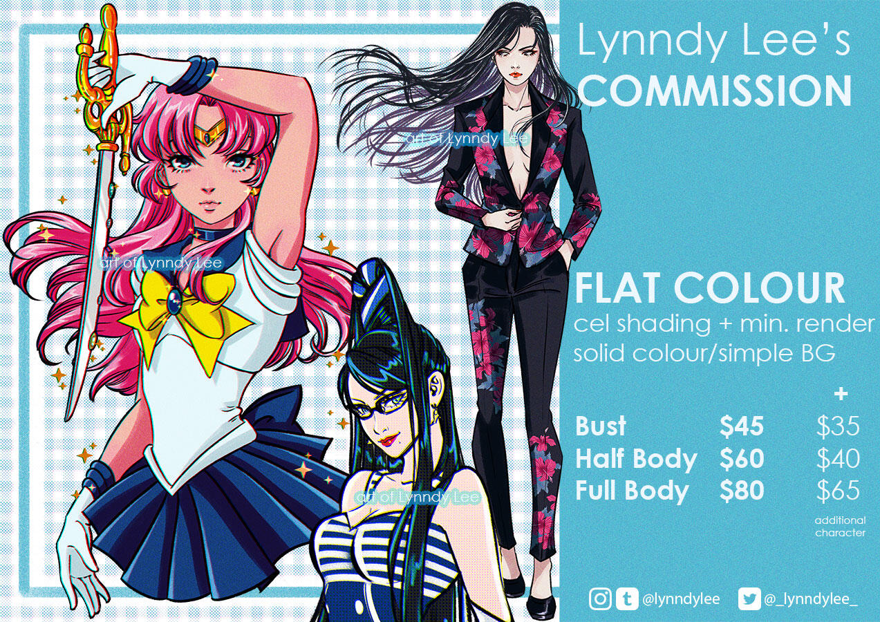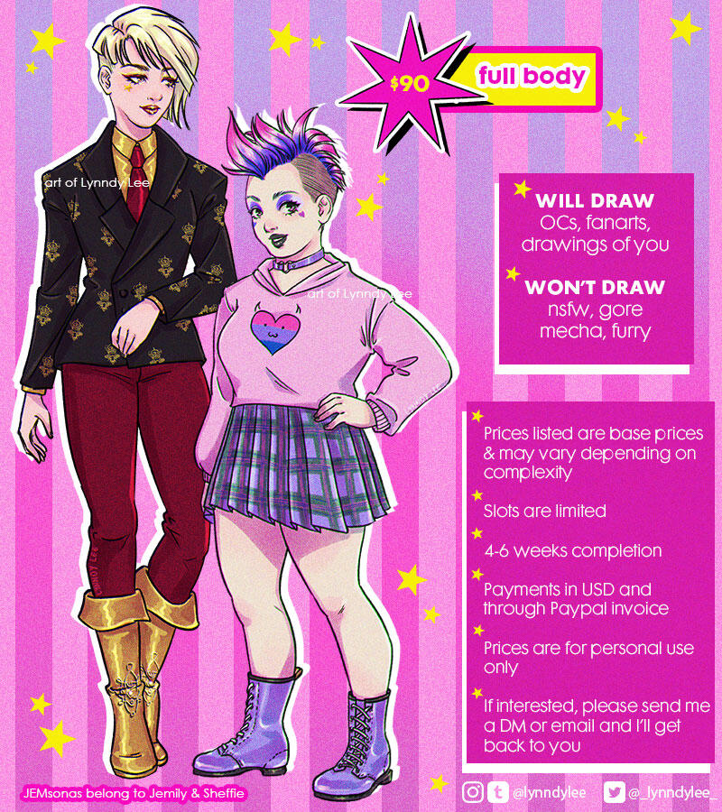 Character sheet is availableExample: 1 Full Body + 1 Half Body (extra) + Bust (extra)